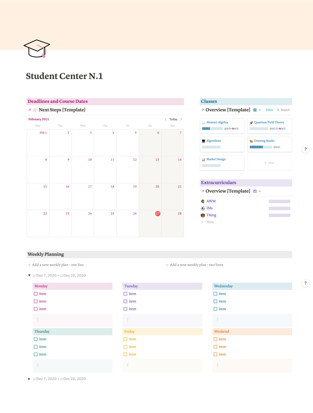 A student hub with integrated note-taking spaced repetitions, weekly planning, due dates calendar & course + extracurricular sub-pages.
